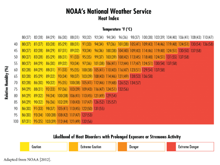 The chart below shows the relative humidity and temperature and how they interplay to create lethal conditions such as heat stroke and death. See the second chart below which is in Celsius for recommendations to protect yourself.